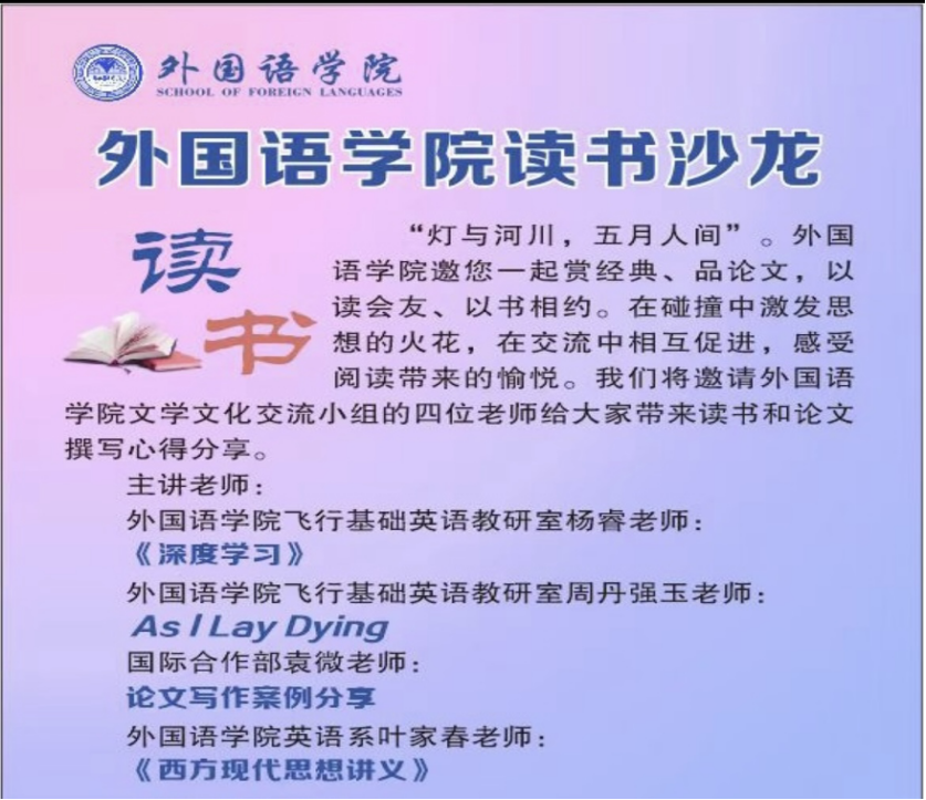 飞行基础英语教研室杨睿老师推介了钟启泉教授的《深度学习》并介绍了“对话”是指基于发现“更优的解”这一共同的目标,并给出结论不是单纯地积累学科的知识,而是要求重建,才是“深度学习”的根本出发点,也给了要以中小学教师为职业目标的同学们以方向。飞行基础英语教研室的周丹强玉老师介绍了诺贝尔文学奖获得者福克纳的经典小说《我弥留之际》,结合故事的主要情节讲述了故事的创作背景和主要寓意,并给同学们阅读习惯和毕业论文写作提供了方向和建议。国际合作部袁微老师分享了自己的论文写作案例,给老师们和学生们提供了很多撰稿以及投稿的经验。英语系叶家春老师推介了刘擎的《西方现代思想主义》,这部讲义中介绍了现代视域下的很多思想大家,广泛而系统地讨论工具理性的利弊,如何面对虚无主义,消费主义对人的异化,财富分配的公平正义和全球化等议题。叶博士建议老师们和学生们多思常思,思考有助于我们真正认识自己,促进与他人的交流。