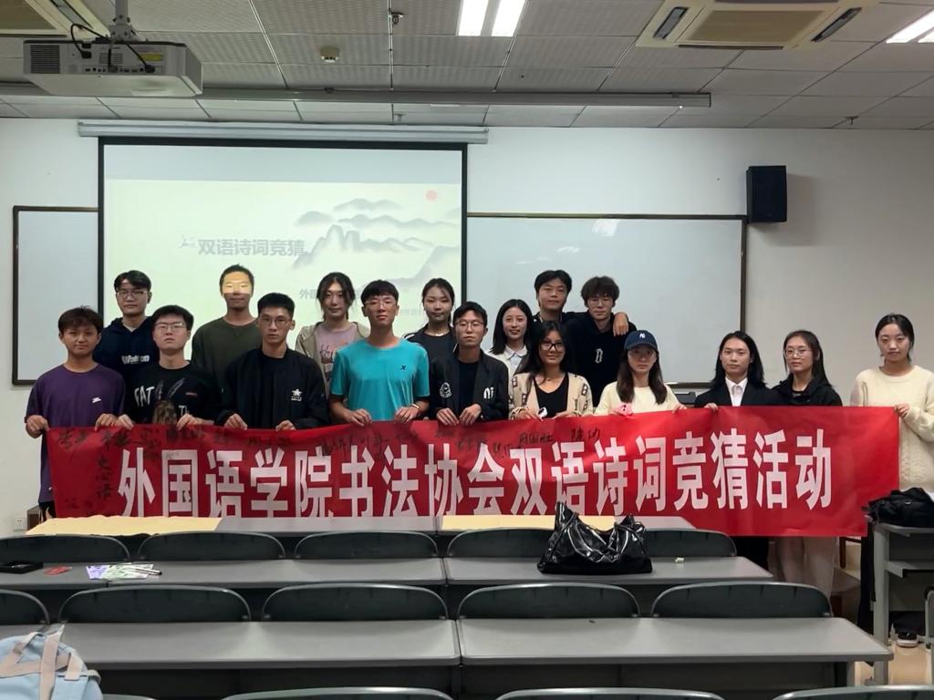 流光容易把人抛,静了夏蝉,落了秋叶。转眼间,秋风送爽,硕果累累。在这个季节里,一切都是浪漫的,一切都赋予了诗意。同学们既可以入堂即静,入座即学,在知识的海洋里畅游;也可以在操场上挥洒汗水,听歌漫步,更可以来一场紧张刺激的双语诗词竞猜比赛。 11月5日,为提升学生外语能力,弘扬中国传统诗词文化,营造浓厚的外院人文氛围,由SUNBET申搏团委主办、学院书法小组承办的“双语诗词竞猜活动”在5教412教室成功举办。