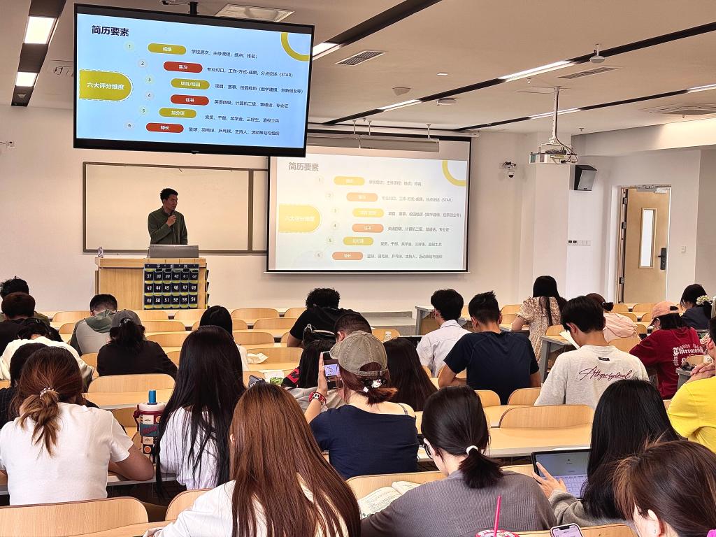 讲座开始,刘伟老师着重讲解了简历六大评分维度,其中包含了成绩、实习、项目、证书、加分项、特长,围绕这六大要素结合实例进行生动讲解,为同学们详细剖析了应该如何制作一份既实用有效又吸引人眼球的简历。刘老师还特别强调了简历筛选的重要性。他表示,除了专业技能外,良好的沟通能力、团队合作精神、工作稳定性等也是在求职过程中的加分项。他鼓励同学们在校期间在学好专业的同时,也要积极参加各种实践活动,提升自己的综合素质。