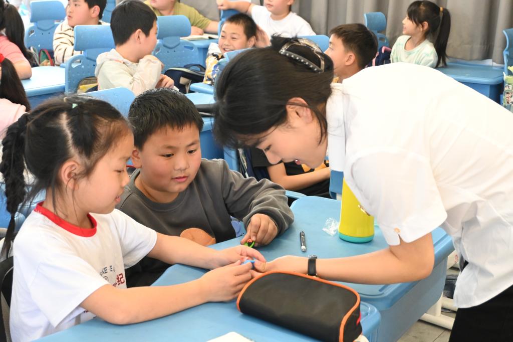 英语口语学习中,志愿者从日常生活中的水果、动物出发,通过带读让孩子们初步感受英语的语音语调。接着,志愿者引导小学生举一反三地造句,从“Hello! How are you?”到 “I like apples.” 每一个简单的句子,志愿者们都耐心地纠正发音,确保小学生掌握准确的口型和发音方法。